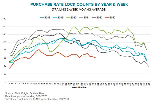 Chỉ số đơn đăng ký mua nhà của Hiệp hội Ngân hàng Thế chấp giảm 2.1% xuống 141.9, mức thấp nhất kể từ tháng 4 năm 1995. Doanh số bán nhà tháng 7 được công bố vào tuần trước cũng thể hiện đà suy yếu xuống mức thấp nhất trong 13 năm.