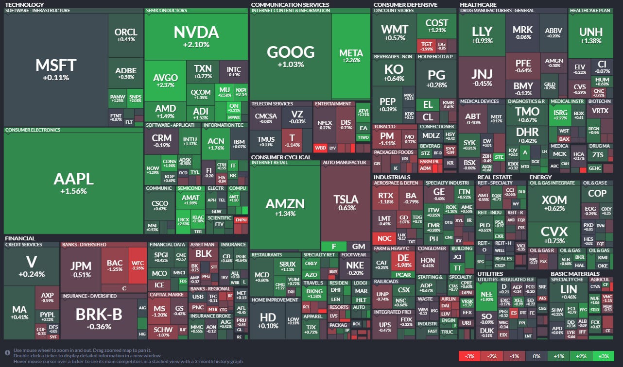 Heatmap cho thấy thị trường được gồng gánh bởi dòng tiền từ khối tech khi lợi tức trái phiếu rút lui từ đỉnh trong buổi sáng ngày hôm nay.