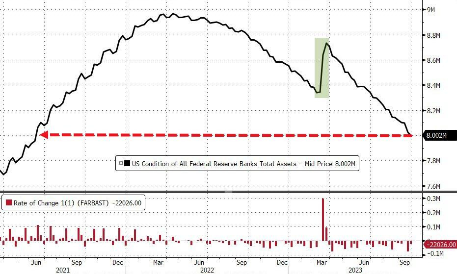 Sau đợt sụt giảm lớn vào tuần trước, Balance Sheet của Fed tiếp tục giảm thêm 22 tỷ USD, mức thấp nhất kể từ tháng 6 năm 2021.
