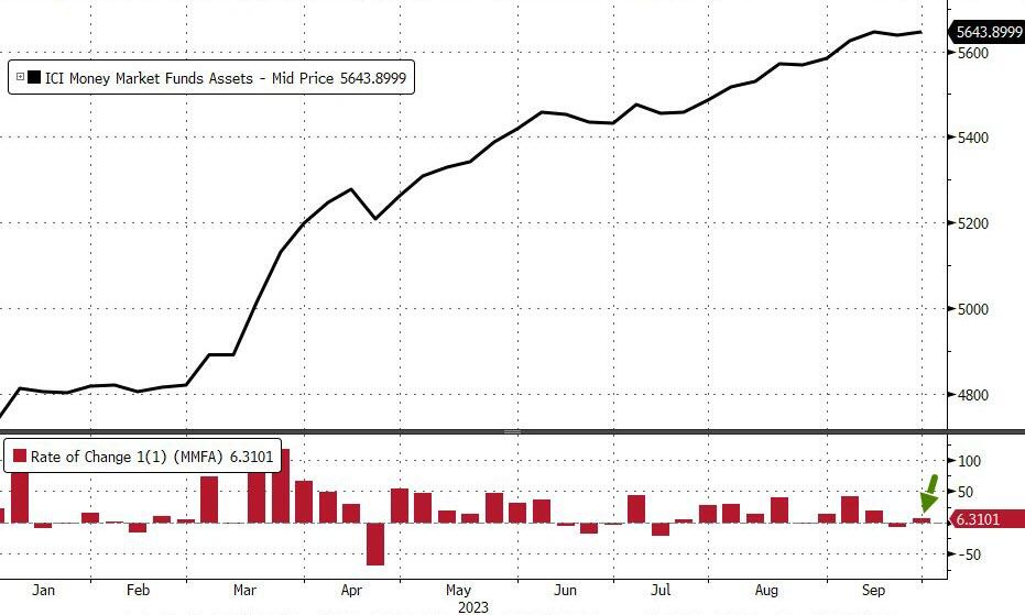 Sau đợt rút vốn bất thường vào tuần trước, các quỹ thị trường tiền tệ đã trở thành nơi giao dịch an toàn mới khi tiếp tục ghi nhận dòng tiền vào tăng +6.3 tỷ USD trong tuần này. Tổng giá trị tài sản đang đạt mức kỷ lục mới 5643 tỷ USD.