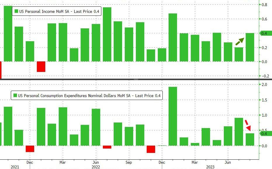 So với tháng trước, chỉ số Thu nhập tăng nhẹ nhưng Chi tiêu lại ghi nhận giảm (cùng đạt 0.4%).