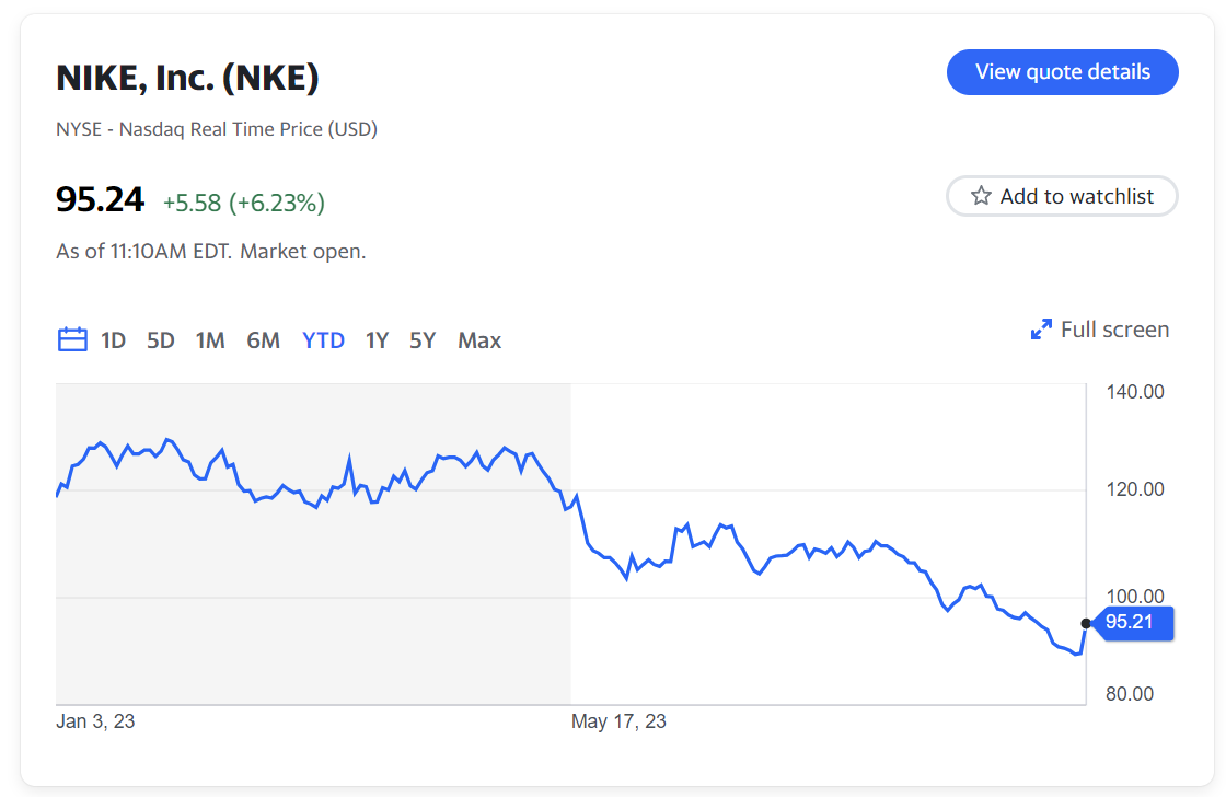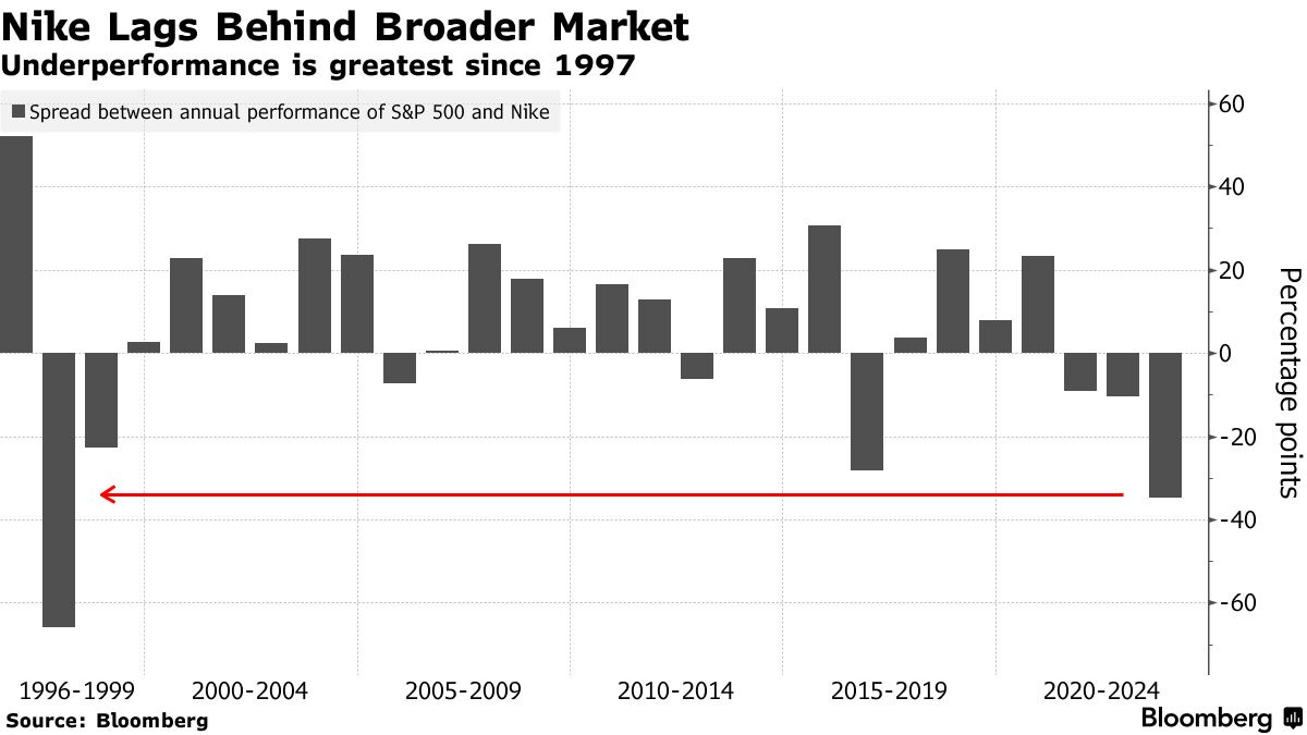 Có thể thấy Nike đang có một năm tồi tệ kể từ 1997 so với thị trường chung, do chi tiêu tiêu dùng suy yếu, cộng thêm mối lo ngại từ Trung Quốc - một thị trường quan trọng của Nike.