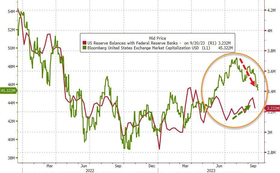 Lãi suất thị trường tăng cũng khiến các ngân hàng giữ tiền mặt tại Fed để kiếm lợi nhuận cao hơn thay vì đầu tư vào thị trường chứng khoán, khiến chênh lệch giữa vốn hóa thị trường chứng khoán và dự trữ ngân hàng tại Fed đang bắt đầu thu hẹp.
