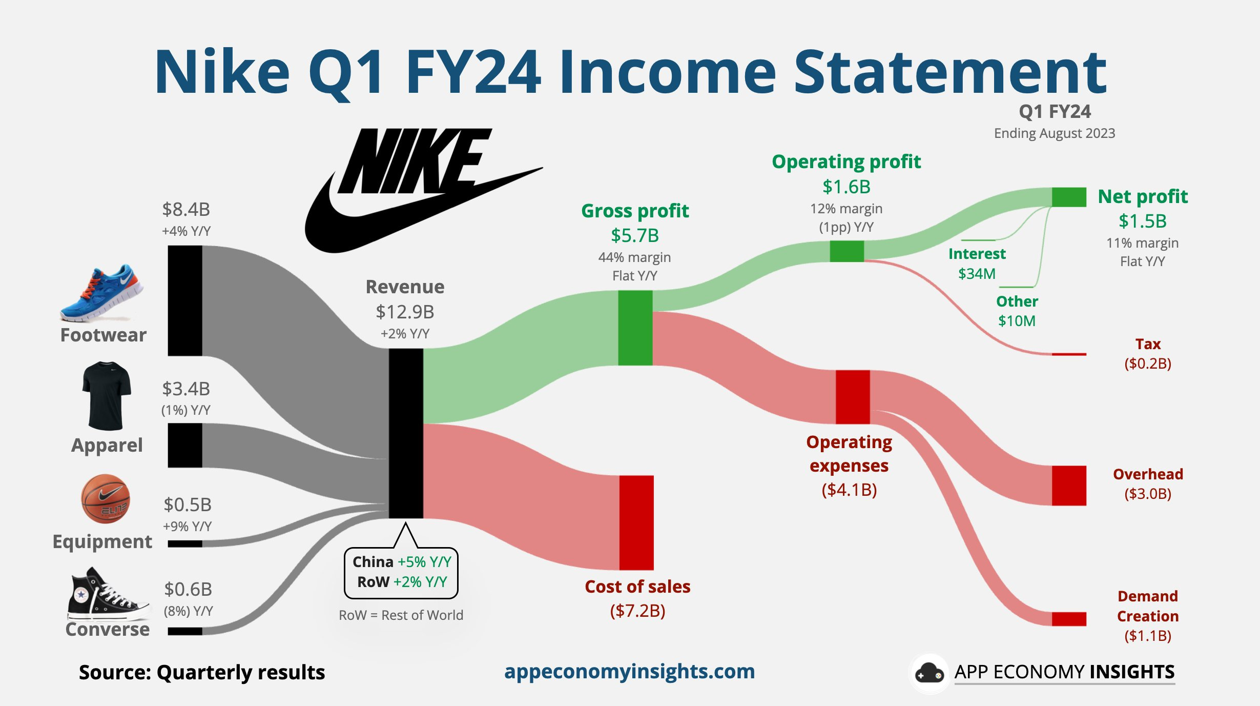 Lần đầu trong 2 năm, Nike không đạt được kỳ vọng về doanh thu, với doanh thu Quý I chỉ tăng 2% so với cùng kỳ (đạt 12.9 tỷ USD). Trong đó doanh thu từ Giày dép chiếm khoảng 65% (+4%).