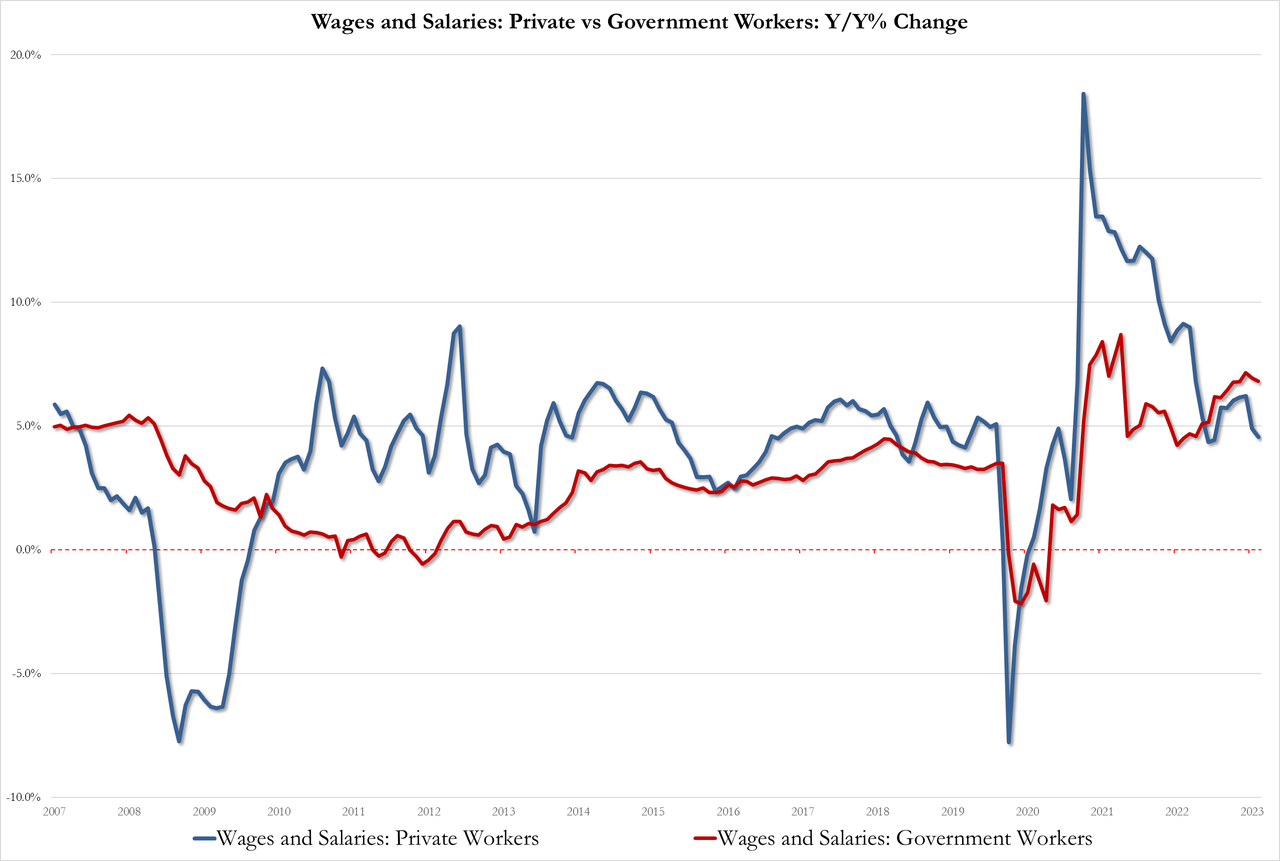 Tốc độ tăng trưởng tiền lương cũng chậm lại. So với cùng kỳ năm ngoái, mức tăng của lao động tư nhân (4.6%) thấp hơn một phần ba so với nhân viên chính phủ (6.8%). Có thể đã đến lúc cân nhắc cắt giảm lương nhân viên chính phủ để giảm lạm phát hiện tại.