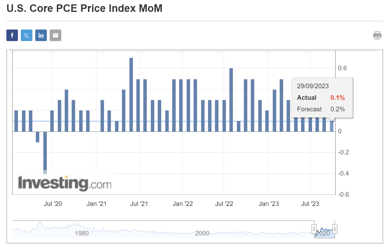 Chỉ số Lạm phát PCE cốt lõi hàng tháng - thước đo lạm phát cơ bản ưa thích của Fed đã tăng chậm nhất kể từ cuối năm 2020. Các nhà giao dịch đang đặt cược rằng đợt tăng lãi suất của Fed đã kết thúc.