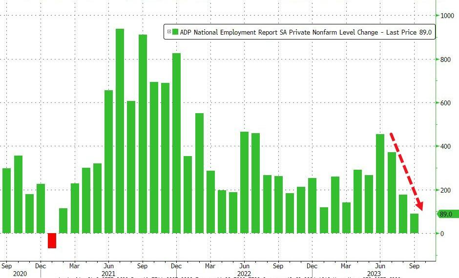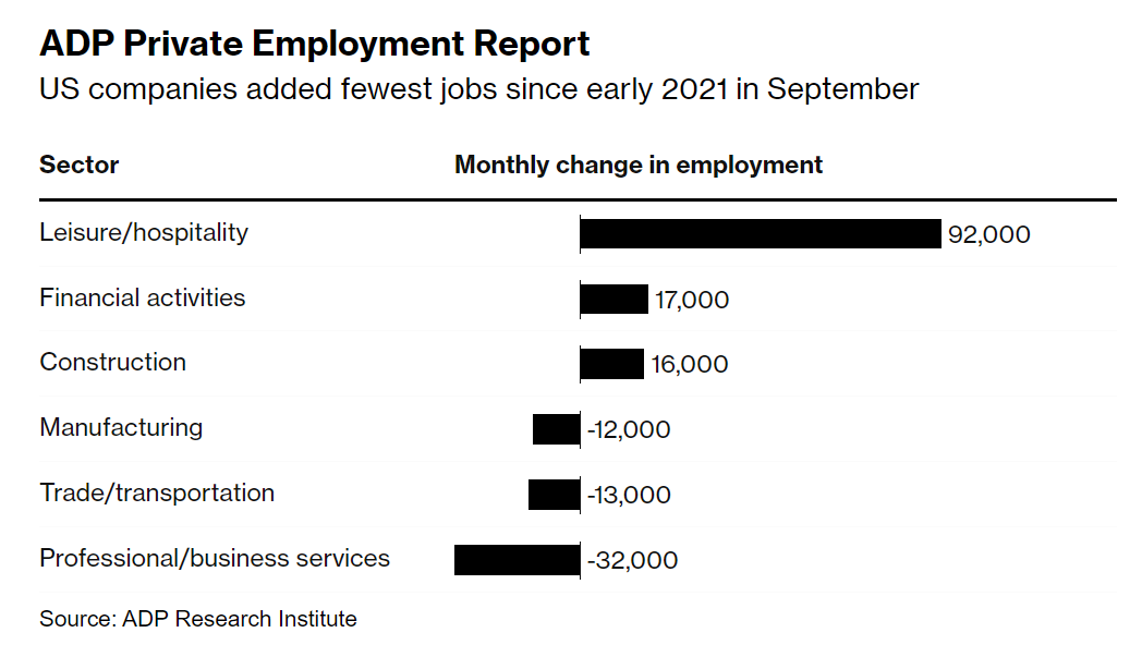 Theo báo cáo việc làm của ADP, thị trường lao động chỉ có thêm 89,000 lao động có việc làm trong tháng 9, mức tăng nhỏ nhất kể từ tháng 1 năm 2021.