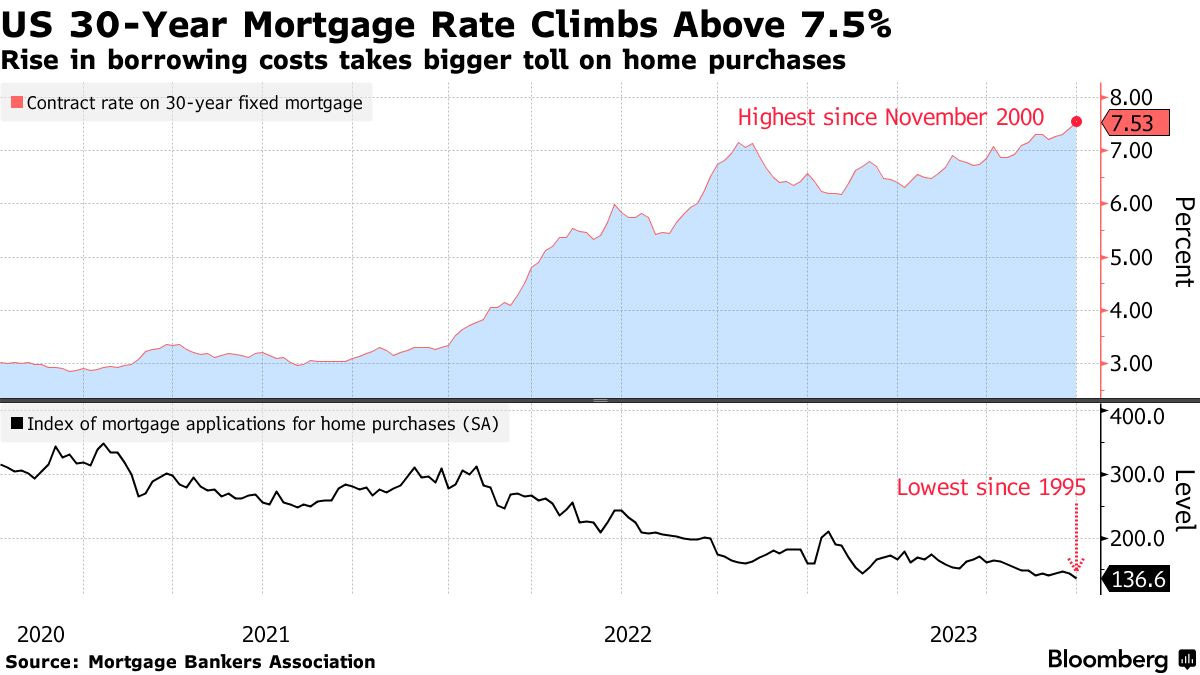 Lãi suất mortgage tuần trước đạt 7.5% lần đầu tiên kể từ tháng 11 năm 2000, số đơn đăng ký mua nhà giảm kỷ lục trong nhiều thập kỷ, minh chứng cho một thị trường nhà ở đang bị ảnh hưởng nặng nề.
