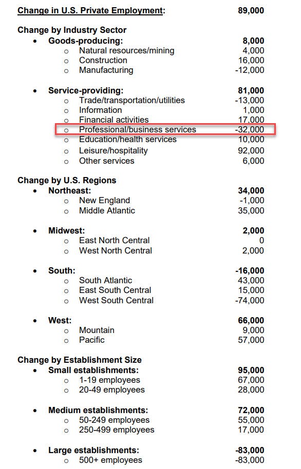 Bất ngờ là ở ngành Dịch vụ kinh doanh, theo thống kê của ADP đã giảm -32,000 việc làm, nhưng theo báo cáo việc làm JOLTS vừa công bố ngày hôm qua, ngành này đã ghi nhận mức tăng mạnh +509,000 việc mở. Điều này cho thấy phần lớn đăng tuyển việc hiện tại trong ngành này mang tính chất “ảo”.