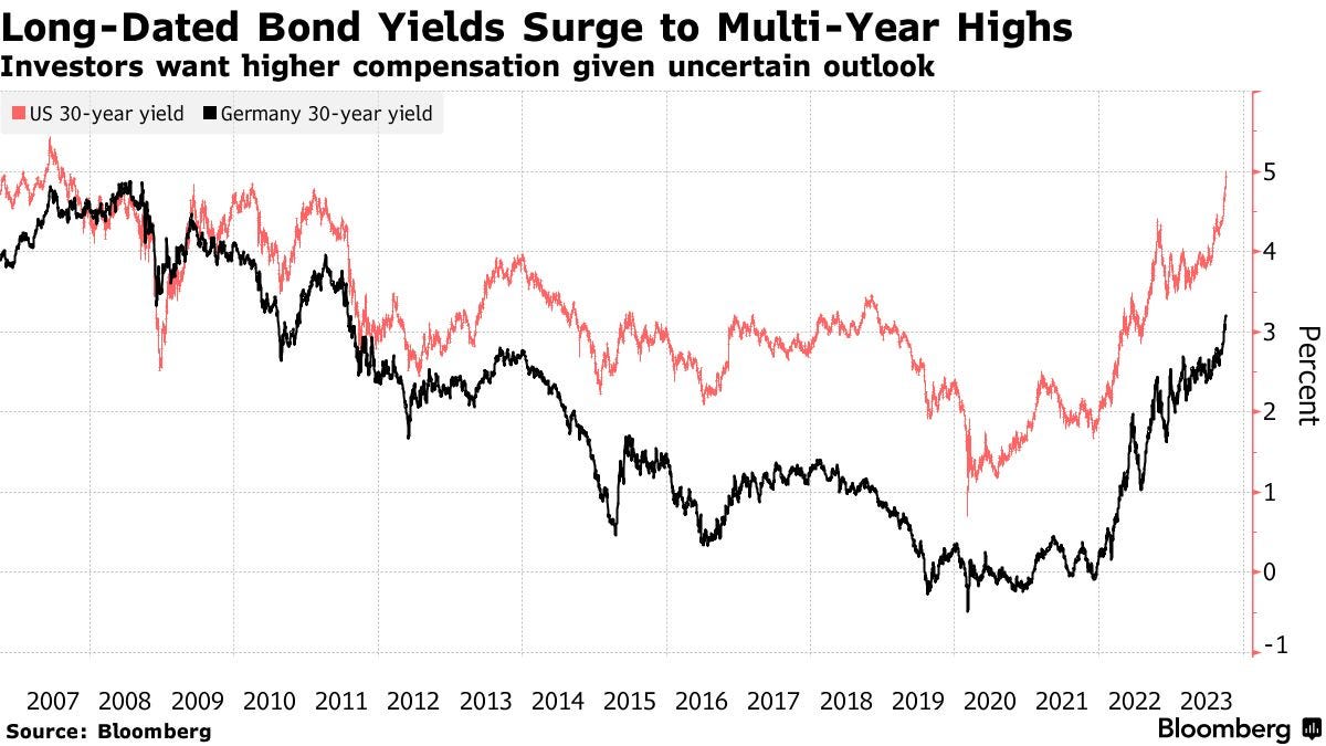 Thâm hụt chi tiêu thúc đẩy phát hành hàng nghìn tỷ USD trái phiếu, khiến làn sóng bán tháo toàn cầu gia tăng. Lợi suất trái phiếu kho bạc 30 năm hôm qua chính thức cán mốc 5%, cao nhất gần 2 thập kỷ.