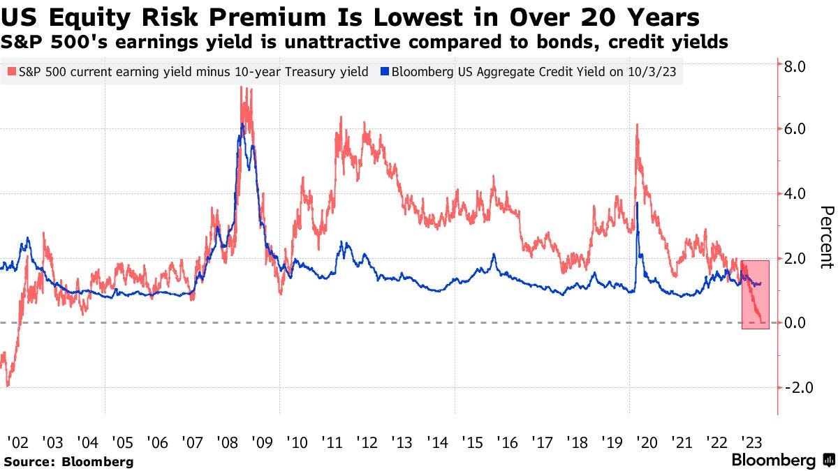 Risk premium của cổ phiếu hiện ở mức gần bằng 0, mức thấp nhất trong hơn 2 thập kỷ, hàm ý rằng các nhà đầu tư chứng khoán không được thưởng khi chấp nhận bất kỳ rủi ro bổ sung nào