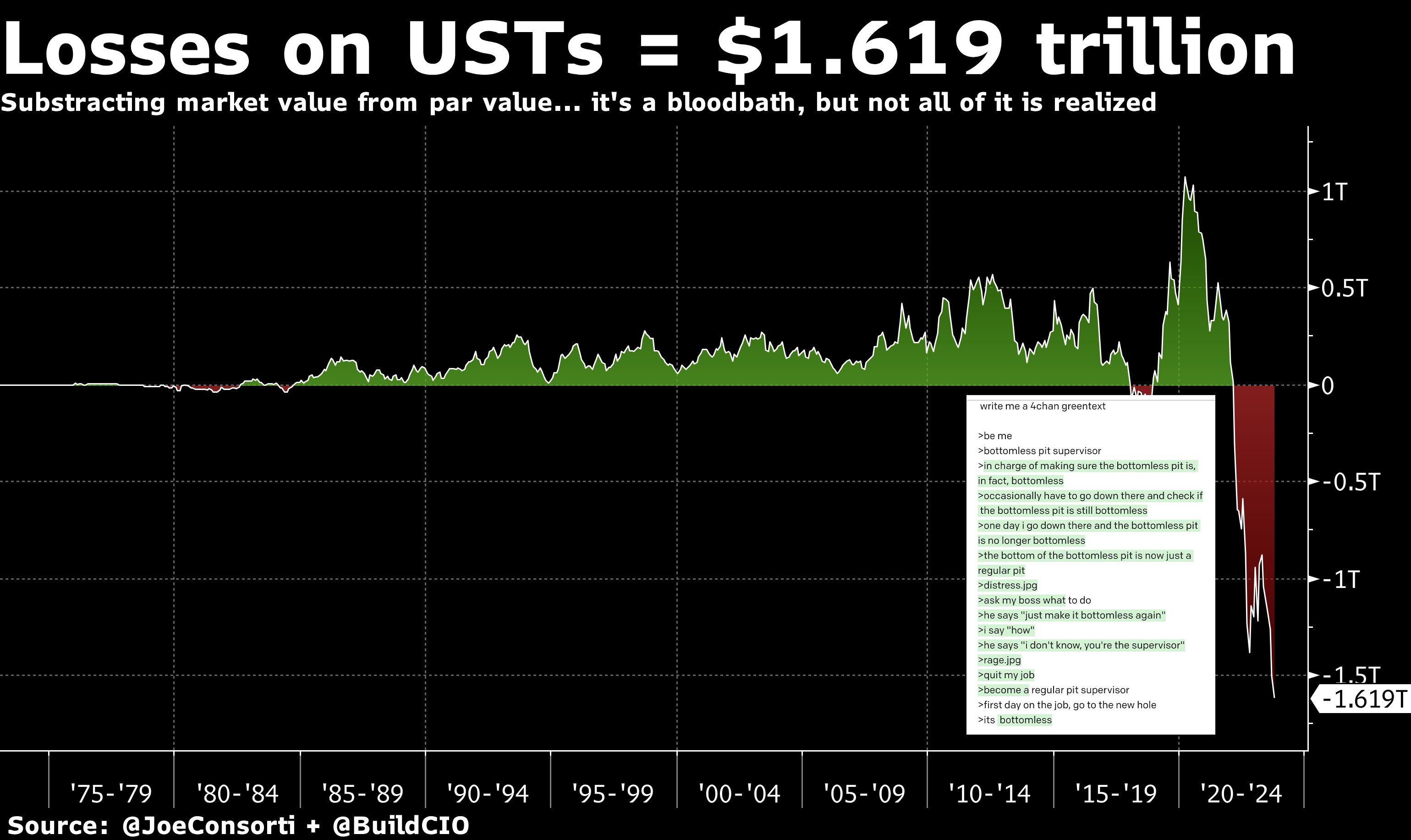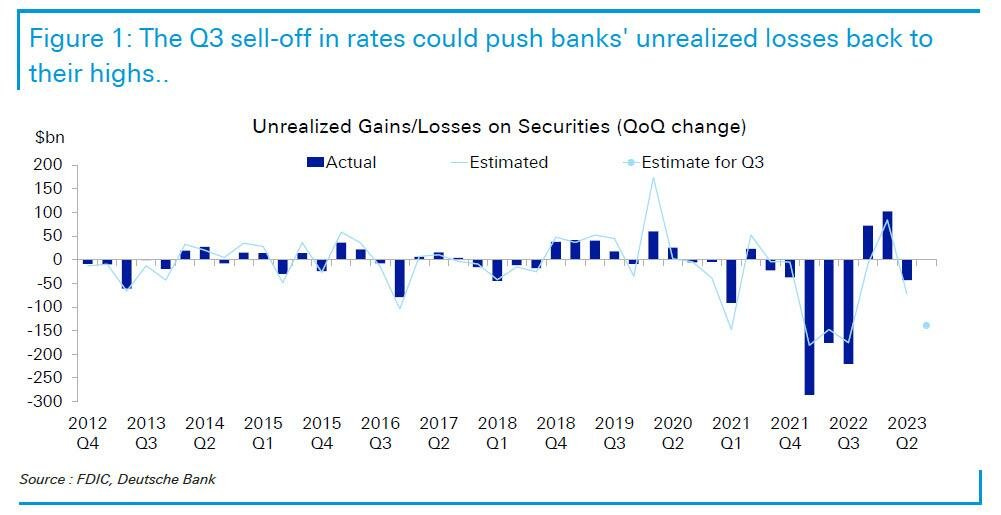 Làn sóng bán tháo trái phiếu khiến các khoản unrealized loss của các ngân hàng tăng cao trở lại. Các ngân hàng Mỹ hiện nắm giữ 5.4 nghìn tỷ USD chứng khoán nợ và đã lỗ 140 tỷ USD trong quý.