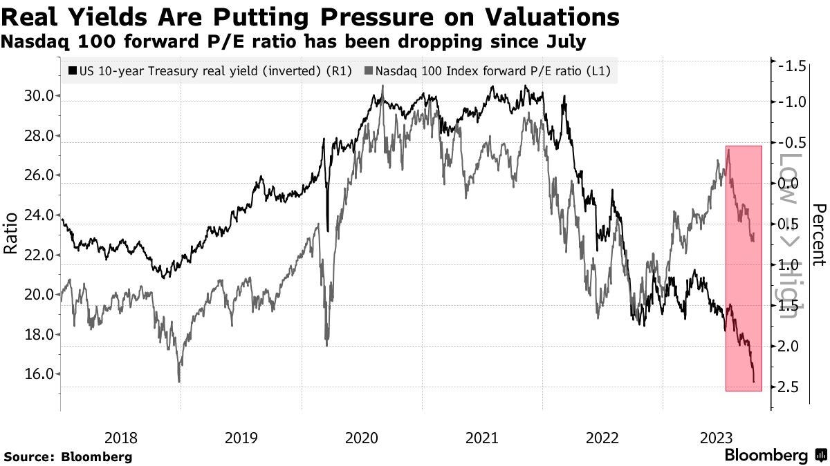 Lợi suất thực tăng khiến định giá của các công ty thấp hơn đáng kể và khiến cổ phiếu bớt hấp dẫn hơn.