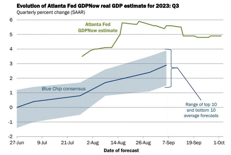 Đây là mức thâm hụt thấp nhất kể từ đại dịch và con số này sẽ phản ánh trực tiếp vào GDP quý 3. GDPNow của Fed Atlanta dự đoán GDP quý 3 là 4.9%.