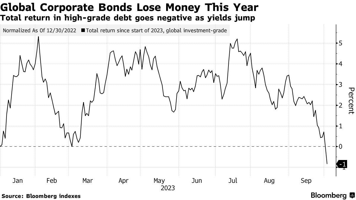 Thị trường trái phiếu doanh nghiệp ghi nhận lợi nhuận âm khi lợi suất trái phiếu chính phủ tăng mạnh.
