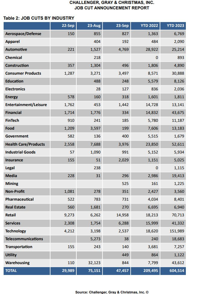 Số liệu sa thải do Challenger công bố: doanh nghiệp đã cắt giảm 47,457 nhân công trong tháng 9, giảm 37% so với mức cắt giảm 75,151 của tháng 8.