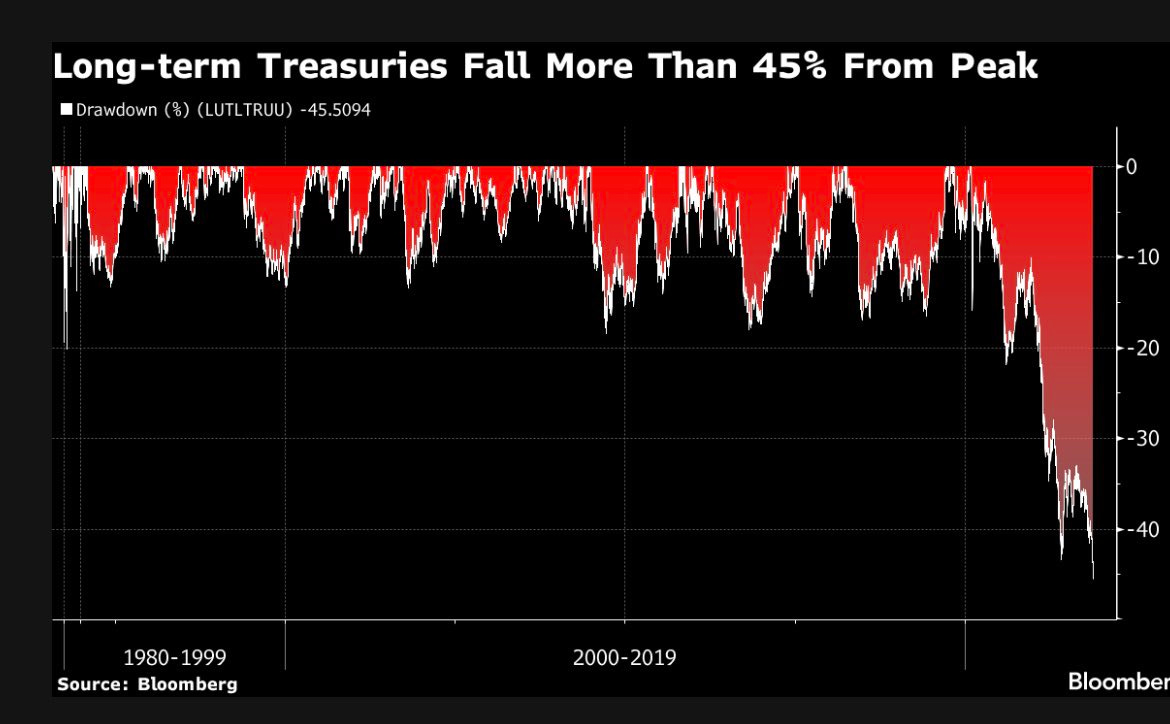 Giá trị trái phiếu kho bạc Hoa Kỳ đã giảm -46% kể từ khi đạt đỉnh vào tháng 3 năm 2020.
