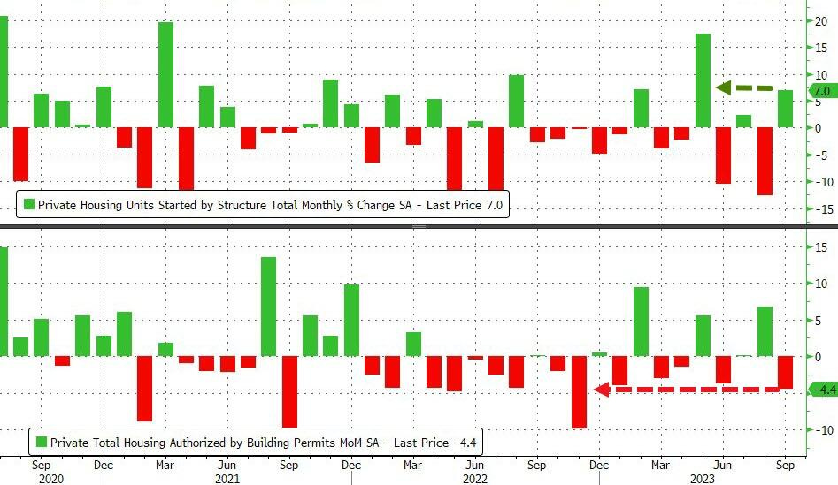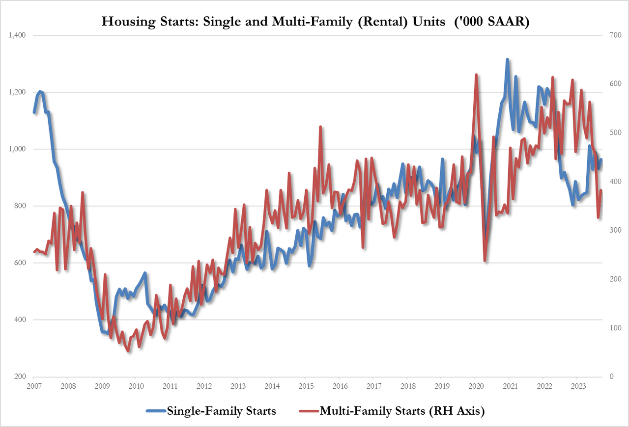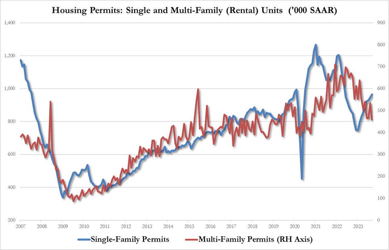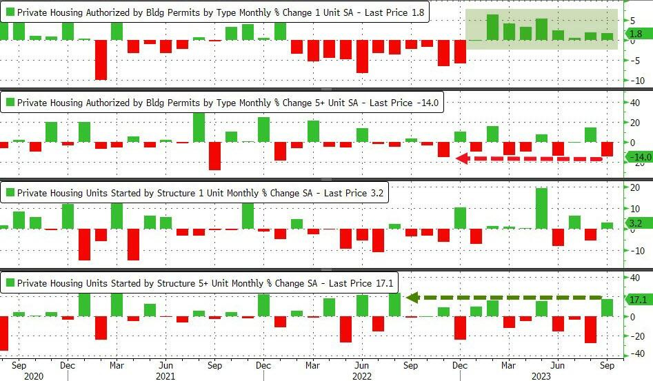 Trong tháng 9, số giấy phép xây dựng cho các căn hộ nhiều gia đình giảm -14% xuống mức thấp nhất kể từ tháng 10 năm 2020, trong khi các ngôi nhà đơn lẻ tăng cao nhất kể từ tháng 5 năm 2020.