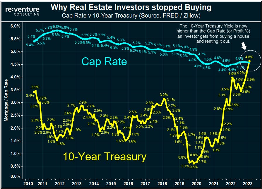 Lãi suất trái phiếu 10 năm đã chính thức vượt qua mức lợi nhuận trung bình lần đầu (median cap rate) kể từ năm 2008. Nói cách khác, đầu tư bất động sản đang có lợi nhuận thấp hơn đầu tư vào trái phiếu 10 năm.