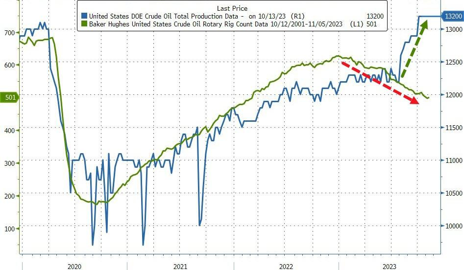 Sản xuất dầu thô duy trì ở mức cao kỷ lục 13.2 triệu thùng/ngày, mặc dù số lượng giàn khoan đang giảm xuống.