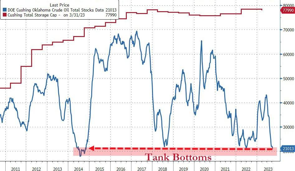 Dự trữ dầu tại Cushing gần mức cạn kiệt, với mức dự trữ thấp nhất kể từ tháng 10 năm 2014.