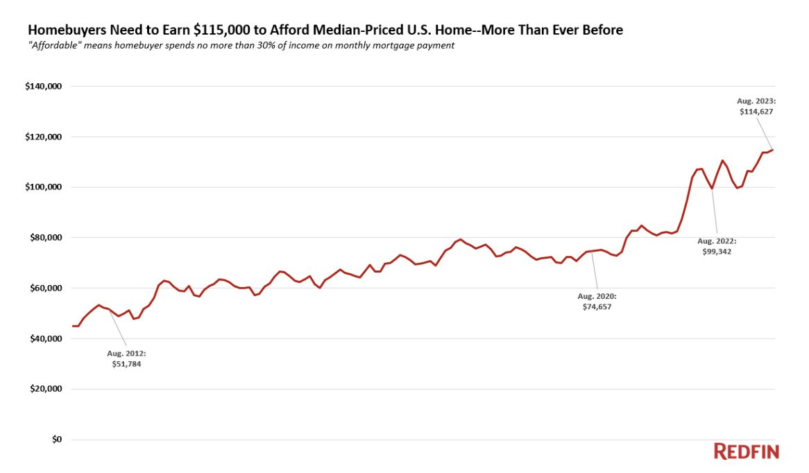Để mua một căn nhà với giá trung bình, người mua cần có thu nhập tối thiểu 115,000 USD. Đây là mức giá cao kỷ lục trong lịch sử và cao hơn hơn 50% so với thời điểm từ đầu đợt đại dịch.