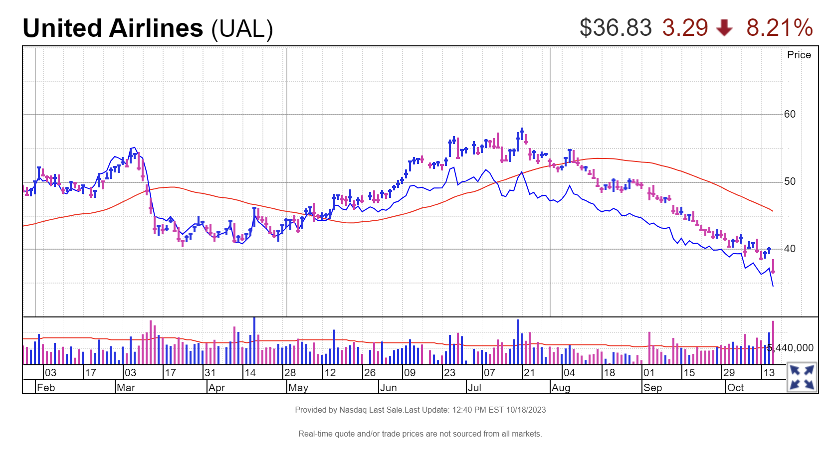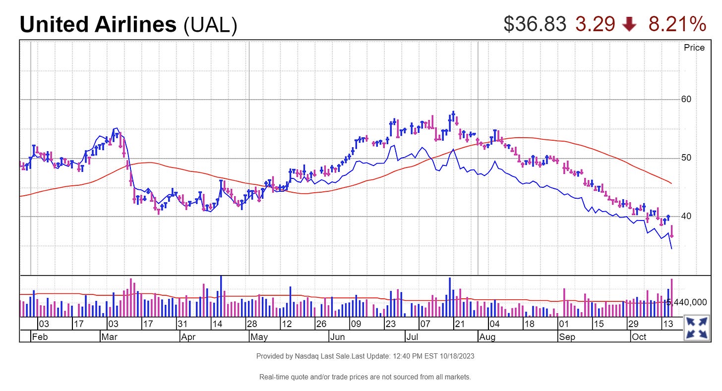 Cổ phiếu UAL giảm hơn 8% trong phiên mở cửa do lo ngại xung đột ở Trung Đông và áp lực giá nguyên liệu tăng cao (dự kiến tăng 11% tới tháng 12).