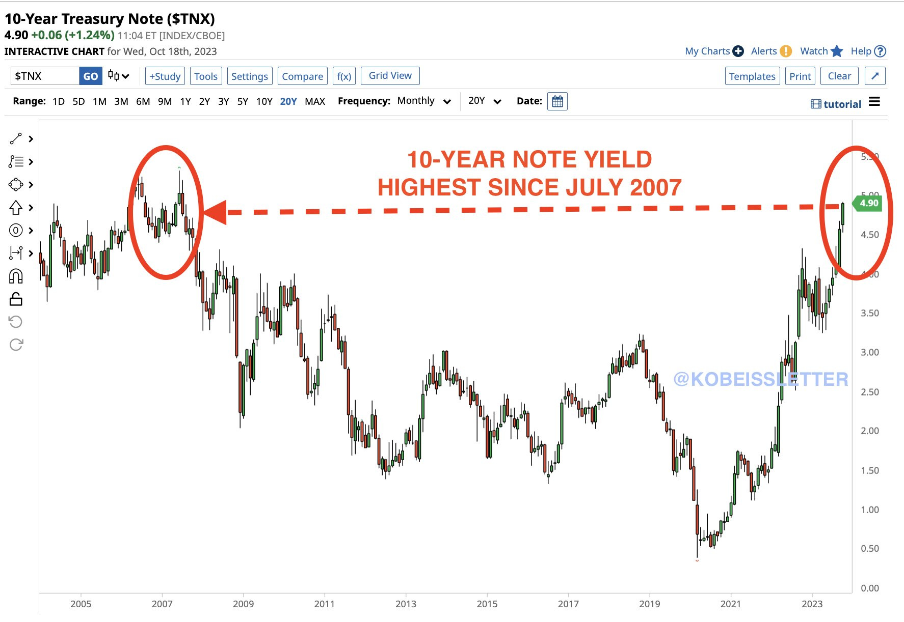 Lãi suất trái phiếu 10 năm cán mốc 4.9%, mức cao nhất kể từ tháng 7 năm 2007. Dự kiến việc giảm lãi suất sẽ không bắt đầu cho đến tháng 7 năm 2024.