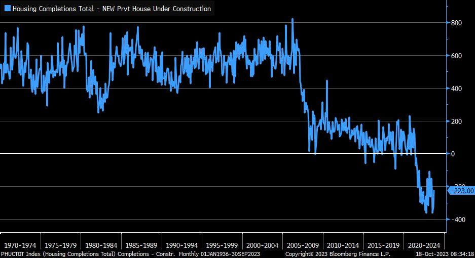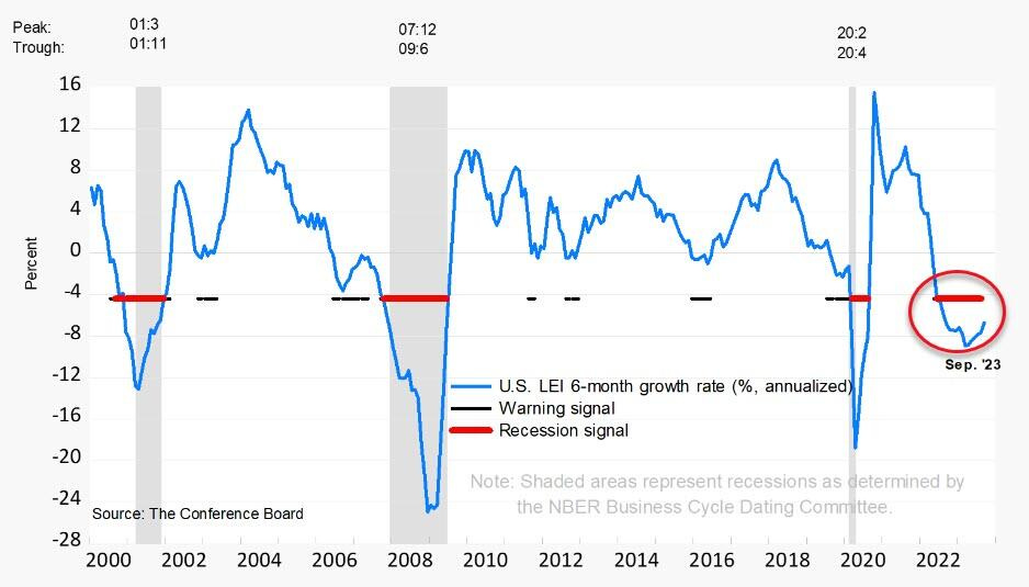 Các chỉ số kinh tế dẫn dắt (LEI) của Conference Board tiếp tục suy giảm trong tháng 9, giảm 0.7% so với tháng trước (tệ hơn mức giảm 0.4% dự kiến) - tháng giảm thứ 18 liên tiếp của LEI - chuỗi giảm dài nhất kể từ khi Lehman Brothers sụp đổ.
