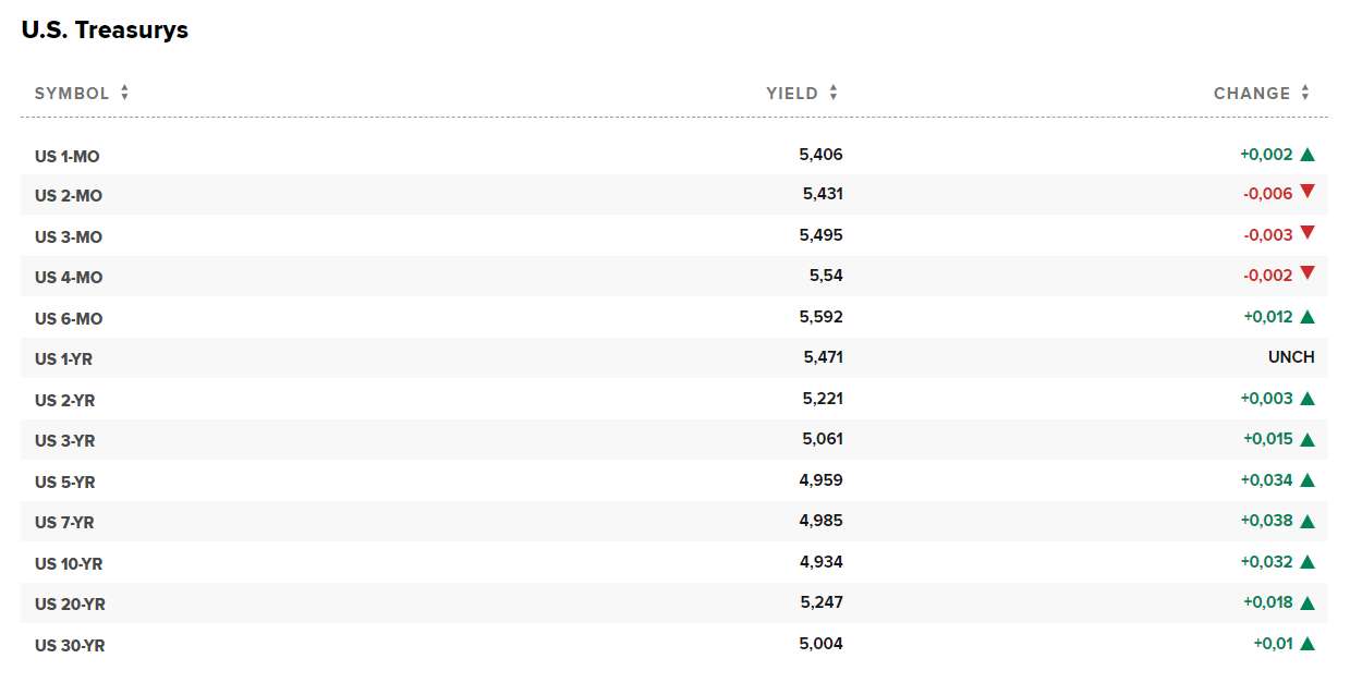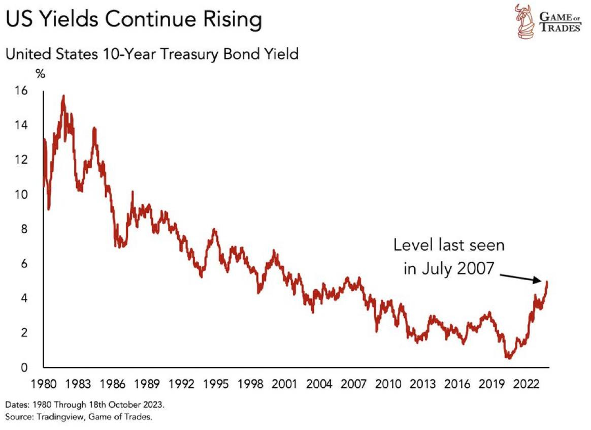 Lợi suất trái phiếu kho bạc kỳ hạn 10 năm tăng tới 4.93%, dần tiến gần đến mốc 5% - mức này được nhìn thấy lần cuối vào tháng 7 năm 2007, trong thời kỳ Đại khủng hoảng tài chính.