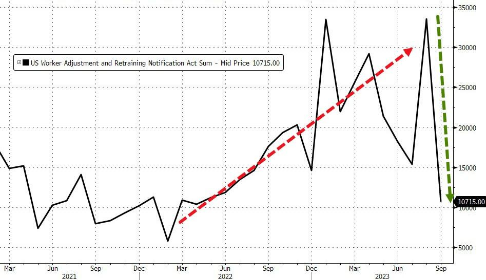 Đảo ngược trend tăng trong hơn 1 năm trở lại đây, thông báo WARN (thông báo điều chỉnh và đào tạo lại người lao động) đột ngột giảm mạnh. Dữ liệu đã có mức giảm hàng tháng lớn nhất kể từ tháng 11 năm 2020 - thời điểm COVID). Điều này cho thấy đơn xin trợ cấp thất nghiệp trong những tuần tới nhiều khả năng sẽ tiếp tục giảm.