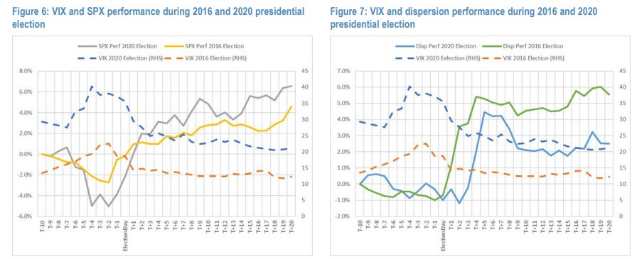 Nhìn lại 2 kì bầu cử trước, VIX đẩy và thị trường gãy tạm thời. Không chỉ SPX điều chỉnh tầm 5% mà cả tỉ lệ dispersion (chênh lệch performance) giữa SPX nói chung và các cổ phiếu chính cũng tăng mạnh. Dispersion tạm đúng khi so sánh SPX với NVDA nhưng trong thời gian qua gần như toàn thị trường đều đi lên.