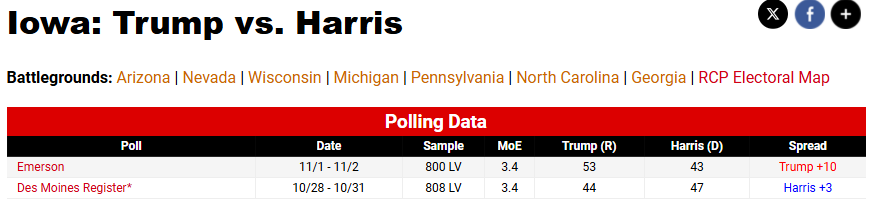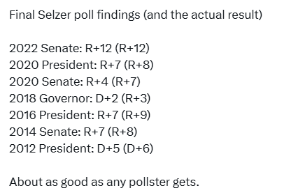 Iowa vốn là thành trì của Đảng Cộng Hòa thì khảo sát mới nhất của Ann Selzer, nổi tiếng về độ chính xác của Iowa lại cho Kamala +3%