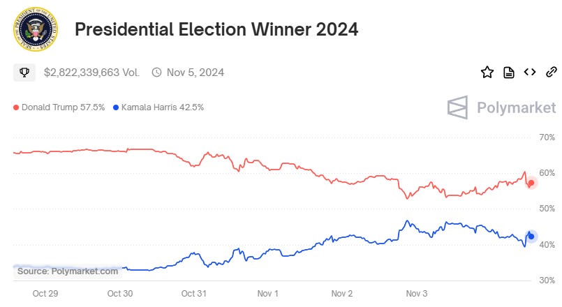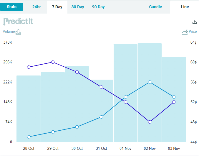 → Ngoài khảo sát của Ann Selzer thì việc thị trường tài chính cũng thật sự di chuyển (converge) về đúng tỉ lệ khảo sát truyền thống ở bên dưới