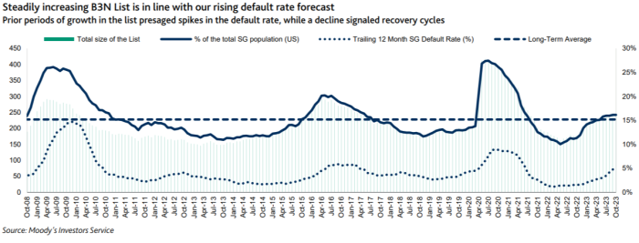 Thống kê của Moody cho thấy khủng hoảng nợ doanh nghiệp thường xảy ra khi số doanh nghiệp xếp hạng BBB- hoặc thấp hơn tăng cao.