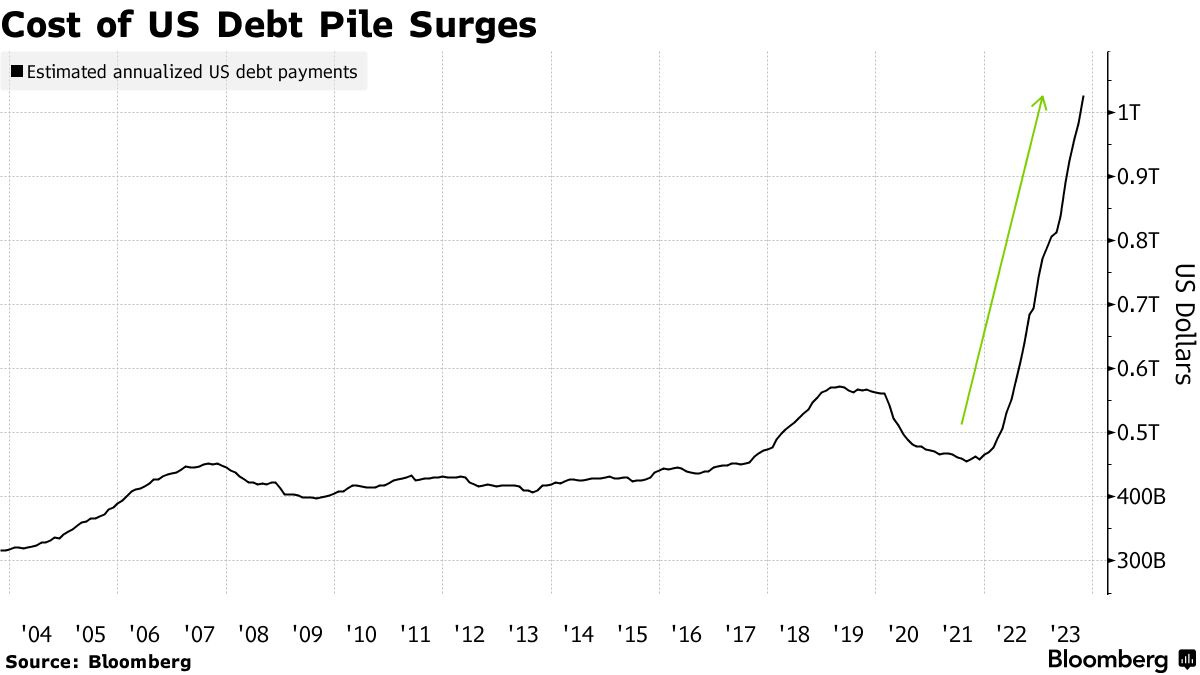 Ước tính lãi vay nợ công hàng năm của chính phủ Mỹ đã vượt quá USD 1000 tỷ vào cuối tháng trước.