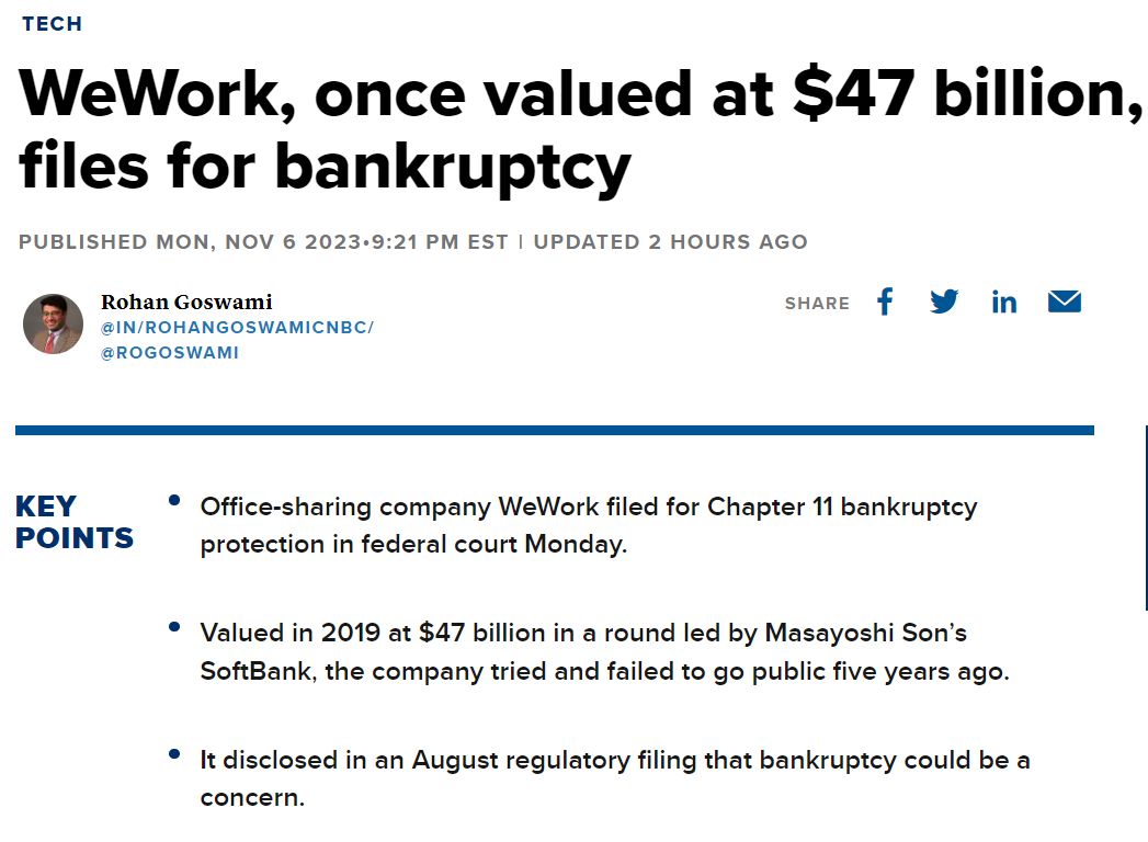 WeWork, công ty chia sẻ văn phòng từng được định giá lên tới USD 47 tỷ, đã nộp đơn xin phá sản theo Chương 11 Luật phá sản của Mỹ.