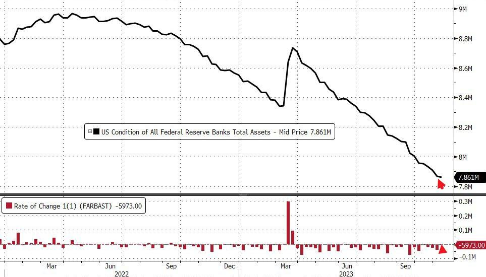 Nhưng bảng cân đối của Fed lại chỉ giảm nhẹ -6 tỷ USD trong tuần qua, dù tổng giảm đã hơn -1.1 nghìn tỷ USD so với mức đỉnh trước đó.