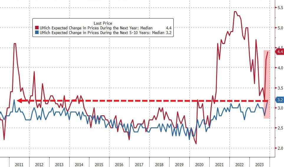Ngược với dự kiến giảm, kỳ vọng lạm phát 12 tháng đã tăng vọt lên 4.4% (so với dự kiến 4%). Kỳ vọng lạm phát dài hạn 5-10 năm cũng tăng lên 3.2%.