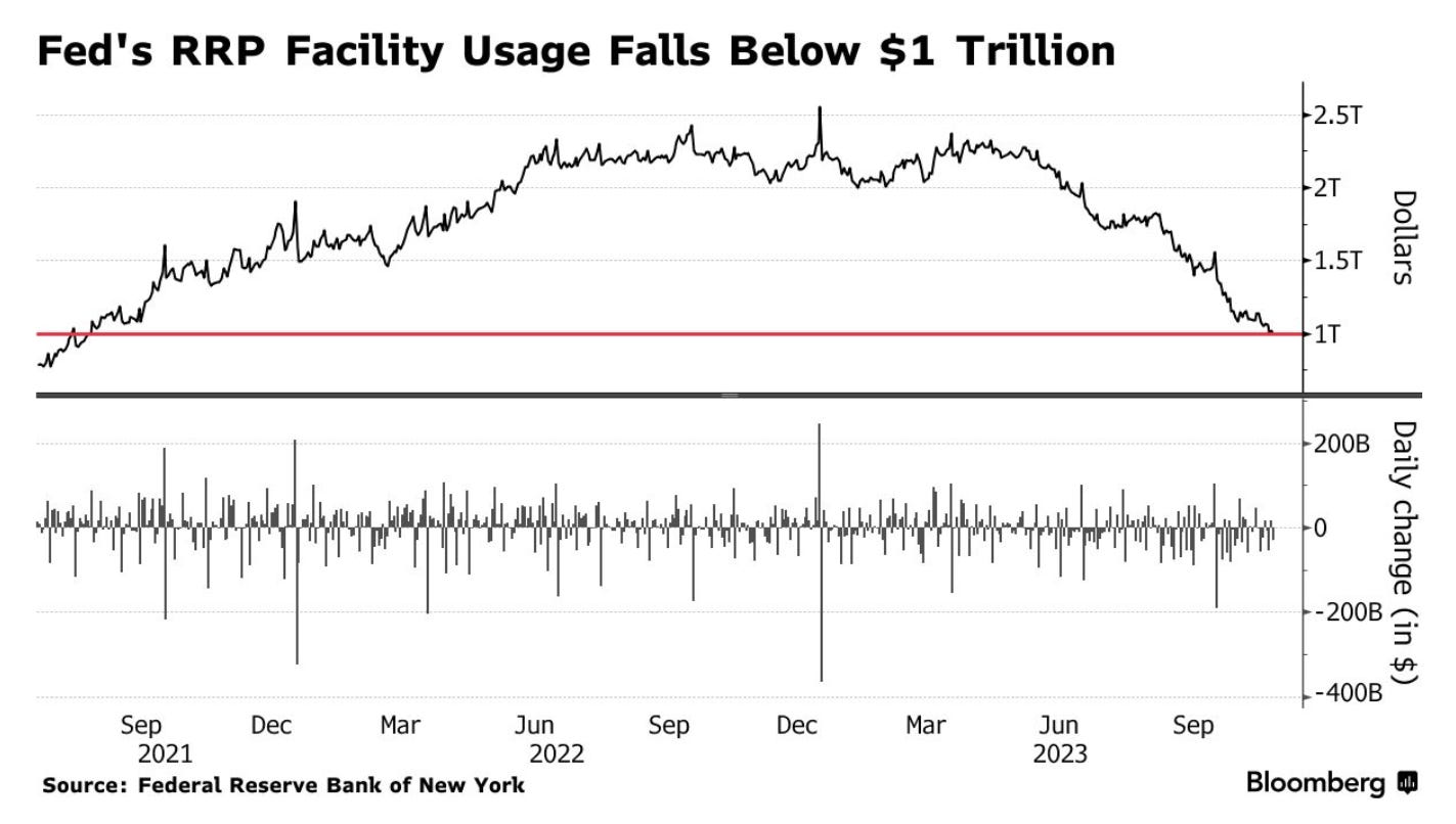 Fed Reverse Repos (RRP) giảm xuống dưới mức 1 nghìn tỷ USD, mức thấp nhất trong hơn hai năm. => Fed vẫn tiếp tục QT!
