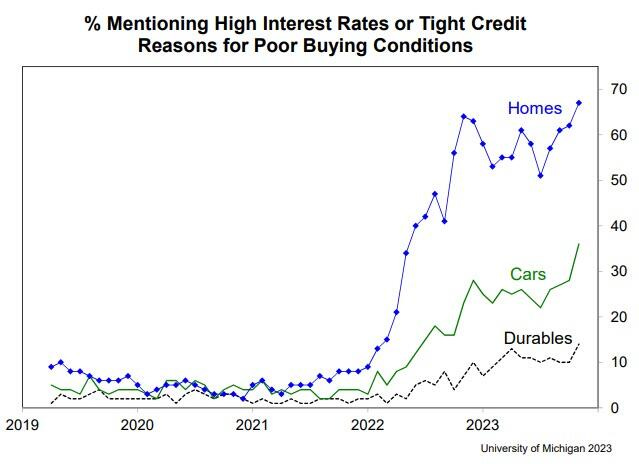 Số lượng người tiêu dùng cho rằng lãi suất cao gây ảnh hưởng đến việc mua nhà, xe cộ và đồ dùng lâu bền liên tục đạt mức cao kỷ lục mới.