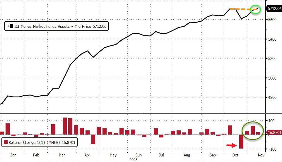 Trong 3 tuần liên tiếp, dòng tiền vào quỹ thị trường tiền tệ (MMF) tiếp tục tăng +16.9 tỷ USD, => tổng giá trị MMF lên cao kỷ lục 5.71 nghìn tỷ USD.
