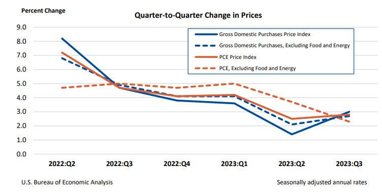 Chỉ số giá tiêu dùng PCE của cả quý III sau khi điều chỉnh đạt 2.8%, PCE cốt lõi (loại trừ thực phẩm và năng lượng) đạt 2.3% — chỉ số cốt lõi khá khả quan.