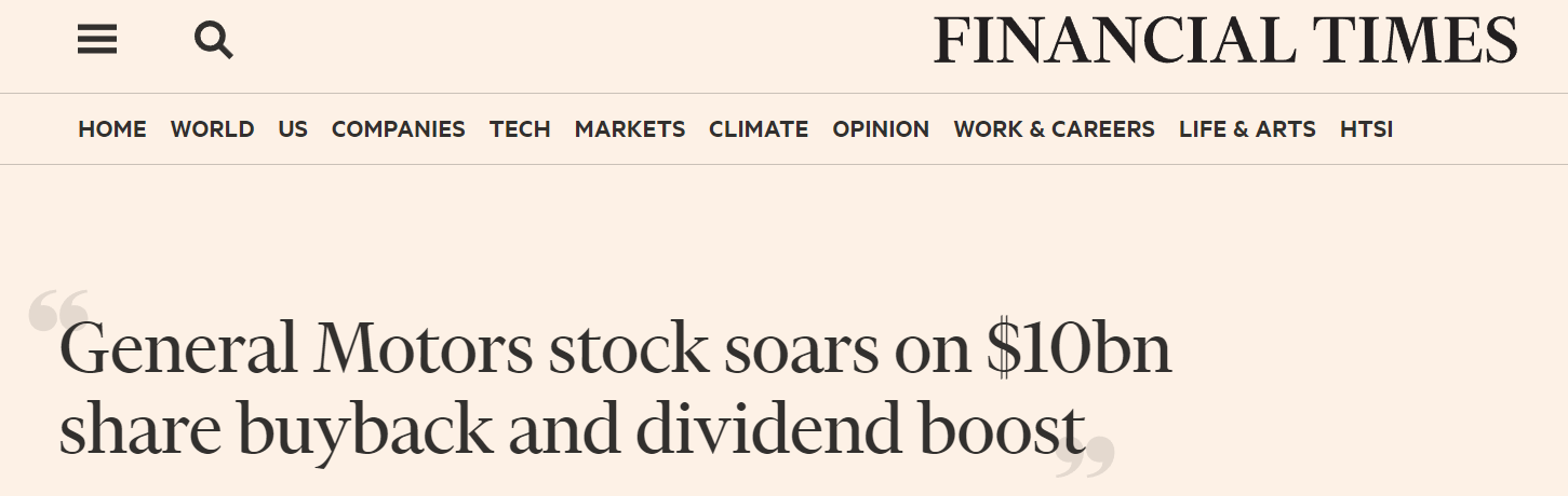 GM lên kế hoạch mua lại 10 tỷ USD cổ phiếu và tăng cổ tức QoQ lên 12 cents/cổ phiếu (~33%) để xoa dịu phản ứng của nhà đầu tư về việc tăng chi phí nhân công.