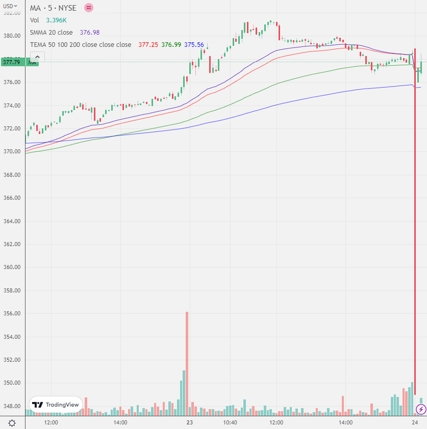 Thị trường mở cửa phiên giao dịch đầu ngày trong tâm lí khá ổn định với SPY giảm nhẹ qua vùng 400 sau báo cáo tài chính của 3M, Verizon và các công ty quốc phòng. Tuy nhiên ngay 10 phút đầu mở cửa, hơn 100 cổ phiếu ngay lập tức bị flash-crash kéo SPY xuống sâu dưới 398 trước khi bị ngừng giao dịch, trong đó có những cái tên lớn như , , , , , kéo gần $400 tỷ giá trị vốn hóa bay hơi khỏi thị trường. Lí do hiện tại được nhiều người đưa ra hiện tại là do giao dịch của nhiều HFT thao túng orderbook thông qua “shorts-ladder-attack” cùng một lúc trong môi trường thanh khoản cực thấp không đủ organic orders dẫn đến lỗi hệ thống tại NYSE. Hiện tại Ủy Ban Chứng Khoán SEC đã lên tiếng sẽ vào cuộc để điều tra sự việc.