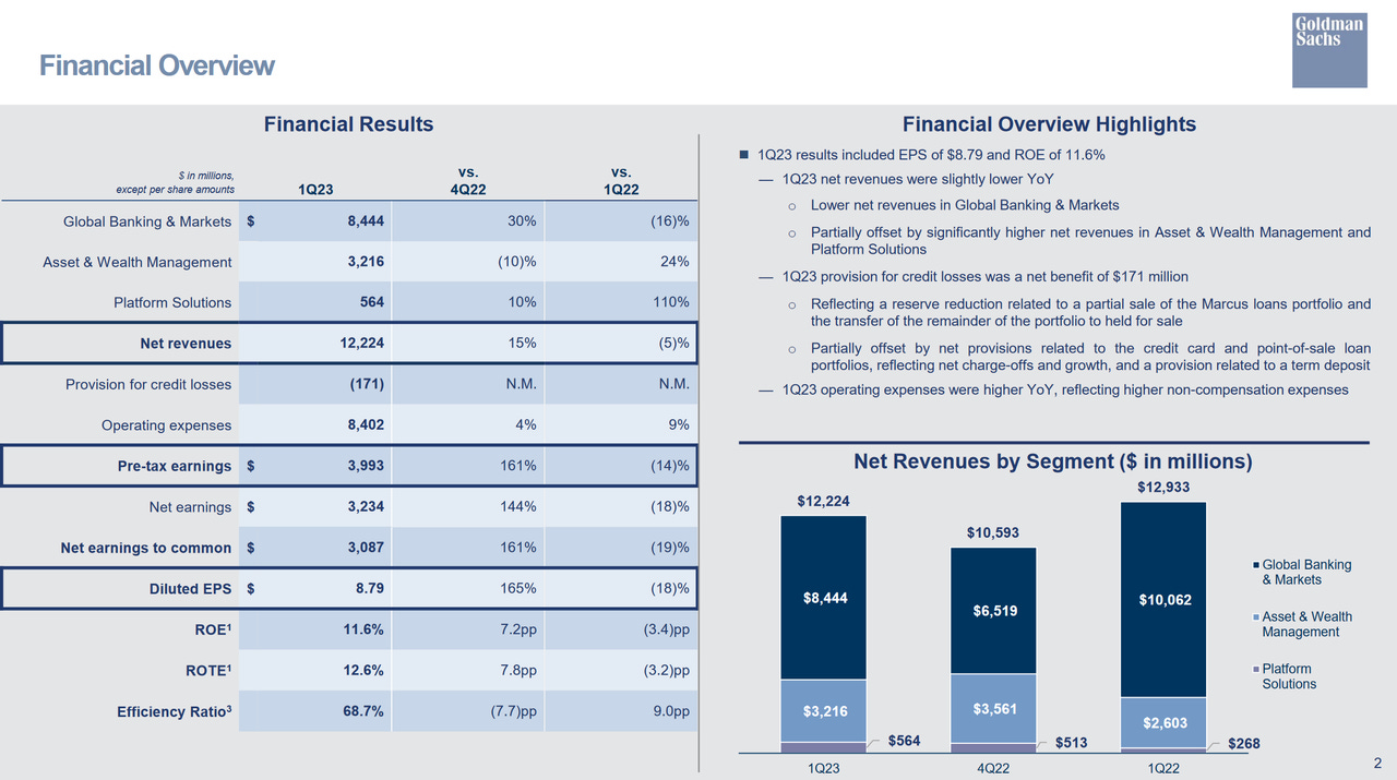 GS là ngân hàng duy nhất trên Wall Street mất tiền ở mảng trade fixed income nhưng nhìn chung vẫn không có quá tệ khi lợi nhuận nói chung vẫn cao hơn mong đợi với phần lớn lợi nhuận đầu tư từ public equities giúp làm giảm đi thua lỗ từ mảng fixed income và private equities.