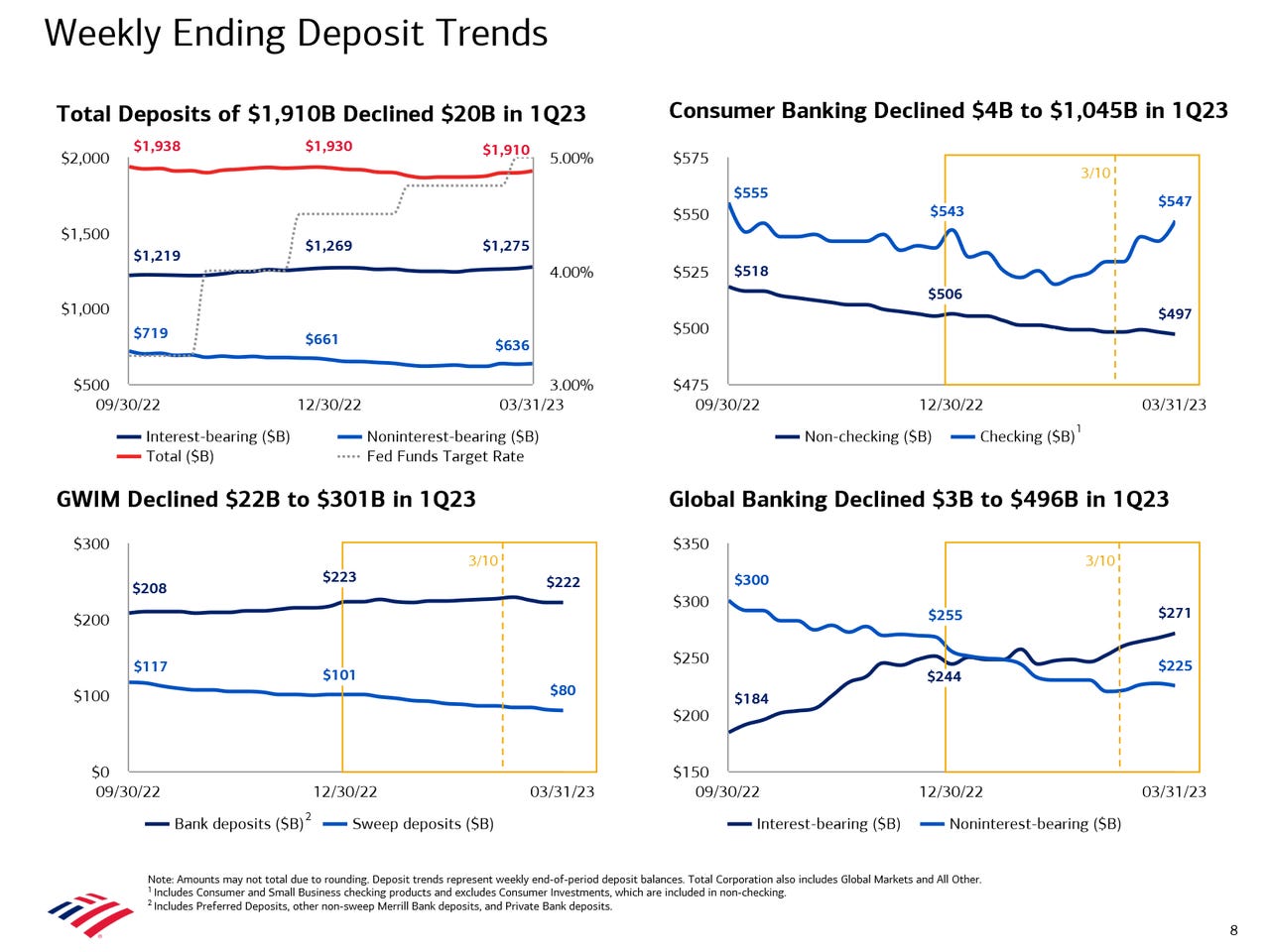 Sau khi SVB và FRC sụp đổ, BAC là ngân hàng được coi là nằm trong nhóm nguy hiểm tiếp theo. Tuy nhiên, báo cáo tài chính sáng nay cho thấy lượng tiền gửi thâm hụt từ người dùng của Bank of America là không có quá lớn với việc management sử dụng nguồn tiền mang tính chất khá hiệu quả, đập tan mọi lo ngại từ nhà đầu tư về ngân hàng này.