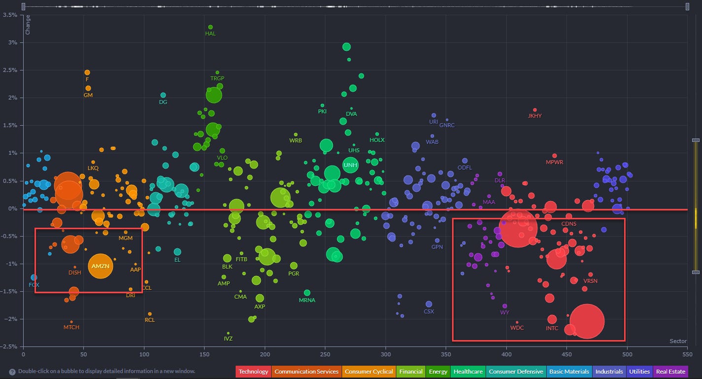 Thị trường chứng khoán Mỹ có một phiên giao dịch khá ảm đạm trong sáng ngày thứ 2 với áp lực đặt nặng lên khối tech ngay từ sau chuông mở cửa. Dòng tiền di chuyển theo hướng defensive khá rõ ràng với nhà đầu tư tạm thời rời bỏ mega-cap tech trong tuần ER quan trọng, kéo SPY và QQQ rớt về tới 411/313 trước khi tìm được support.