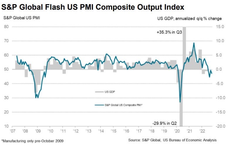 Trên vĩ mô, chỉ số U.S. S&P PMI Công Nghiệp giảm trong tháng 10, chạm 49.9 so với mốc 51 dự báo, ngành Dịch Vụ cũng giảm chạm 46.6 vs 49.5 mong đợi trong khi chỉ số chung về 47.3 vs 49.3 dự báo. Tất cả cho thấy kinh tế toàn cầu tiếp tục thay đổi theo chiều hướng tiêu cực và chính thức đi vào vùng tăng trưởng suy thoái (thay đổi theo quý hàng năm dưới 0%)