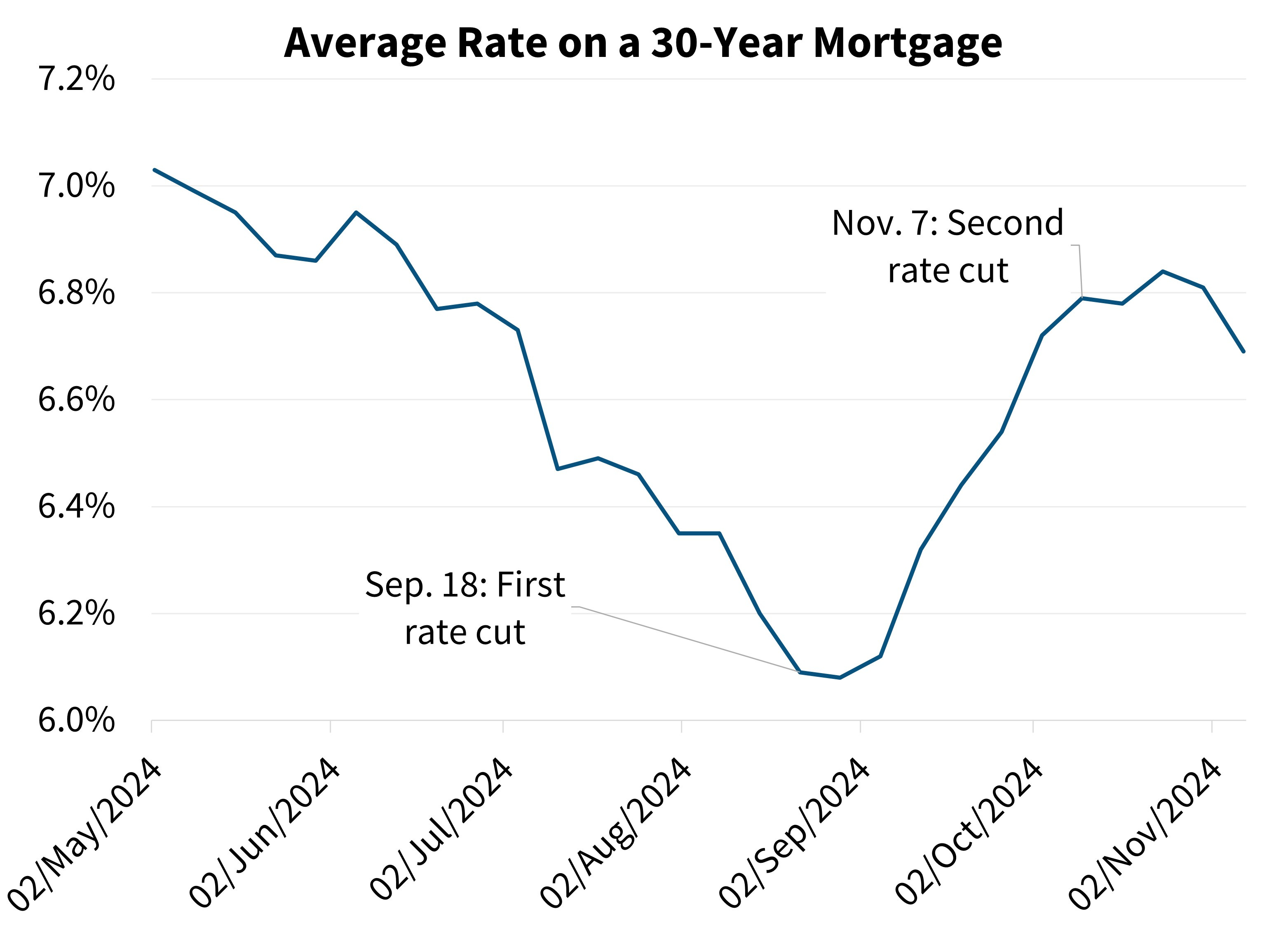 Tháng 9/2024, Fed chơi cú “jumbo” – cắt 50 bps. Cả thị trường thở phào, ai cũng nghĩ mortgage sẽ hạ nhiệt. Nhưng nhìn lại chart 30Y FRM (Fixed-Rate Mortgage - khoản vay mua nhà cố định): lãi 30 năm đã trượt dần từ ~7.0% về sát 6.1% ngay trước ngày 18/9, rồi quay đầu tăng sau cú cắt đó, leo lên quanh 6,8% vào đầu tháng 11 (đúng lúc có thêm một lần cắt nữa) trước khi dịu nhẹ trở lại. Hai nhát kéo FFR (Fed Fund Rate - Lãi suất qua đêm của FED) không tạo được xu hướng giảm bền. Đó chính là disconnect bạn đang thấy, không phải ngoại lệ.